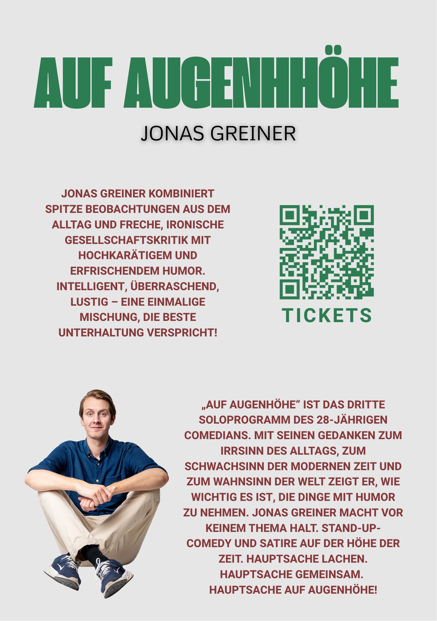„Auf Augenhöhe“ ist das dritte Soloprogramm des 28-jährigen Comedians. Mit seinen Gedanken zum Irrsinn des Alltags, zum Schwachsinn der modernen Zeit und zum Wahnsinn der Welt zeigt er, wie wichtig es ist, die Dinge mit Humor zu nehmen. Jonas Greiner macht vor keinem Thema halt. Stand-Up-Comedy und Satire auf der Höhe der Zeit. Hauptsache lachen. Hauptsache gemeinsam. Hauptsache auf Augenhöhe!